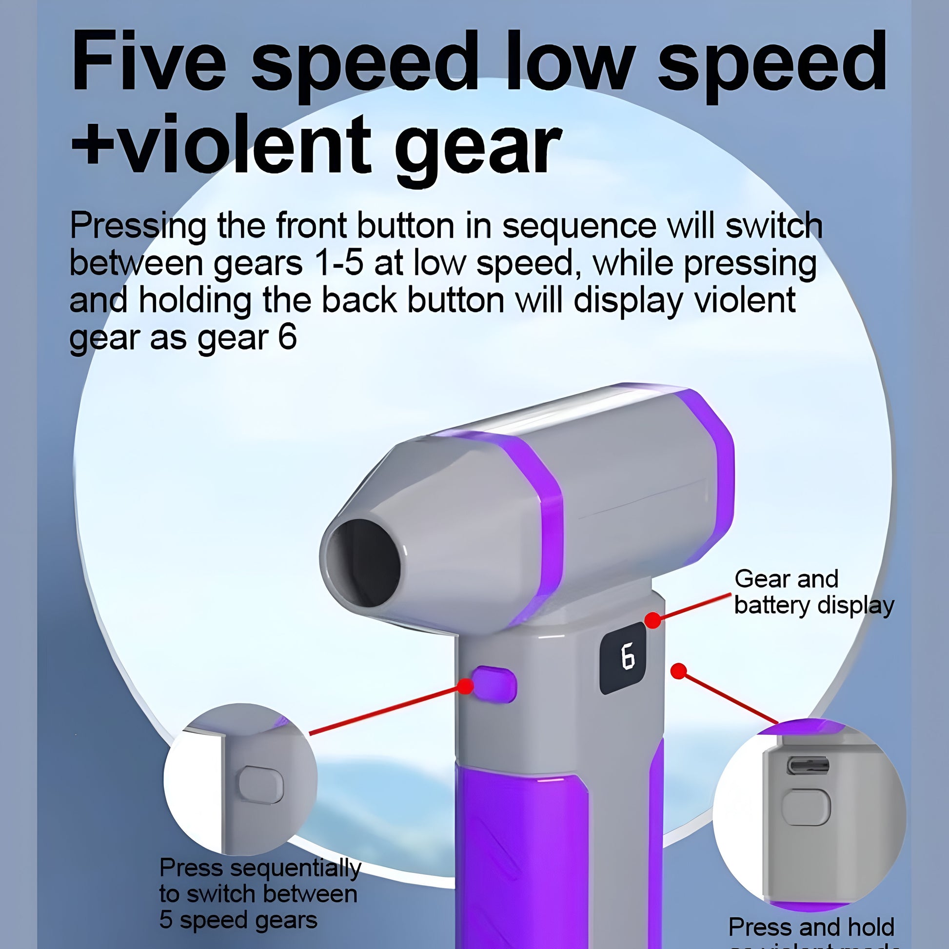 This intuitive display lets you monitor settings without guessing or overdraining the battery. - Fast USB-C Charging & Long Battery Life: Equipped with a USB-C port for modern, fast charging. The built-in battery supports extended usage on lower gears and offers high output when you need power most—recharge quickly and get back to high-performance airflow.