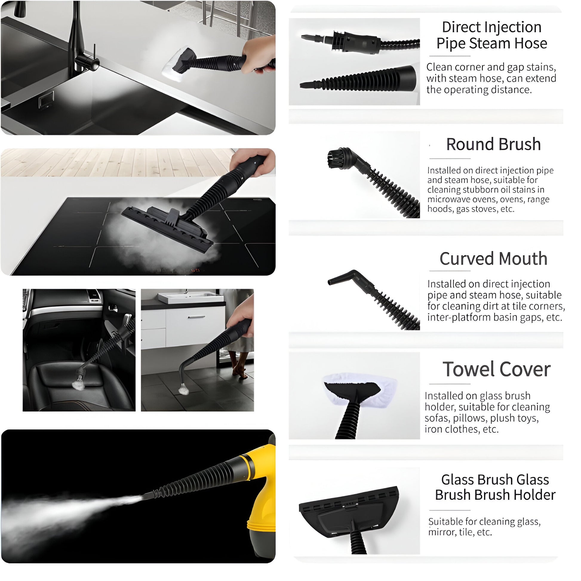 Tackle dirt, grease, and germs the natural way with this Portable Handheld Steam Cleaner. Designed for powerful, chemical-free cleaning, it delivers up to 3.0BAR pressurized steam at 150°C to remove even the most stubborn stains. Whether you're sanitizing your bathroom, detailing your car, or refreshing your sofa, this multi-functional steam cleaner comes equipped with 10 accessories—including nozzles, brushes, and cloths—to reach every corner. Featuring a child lock, auto shut-off, and anti-scald design, it’s safe, efficient, and eco-friendly for every household.