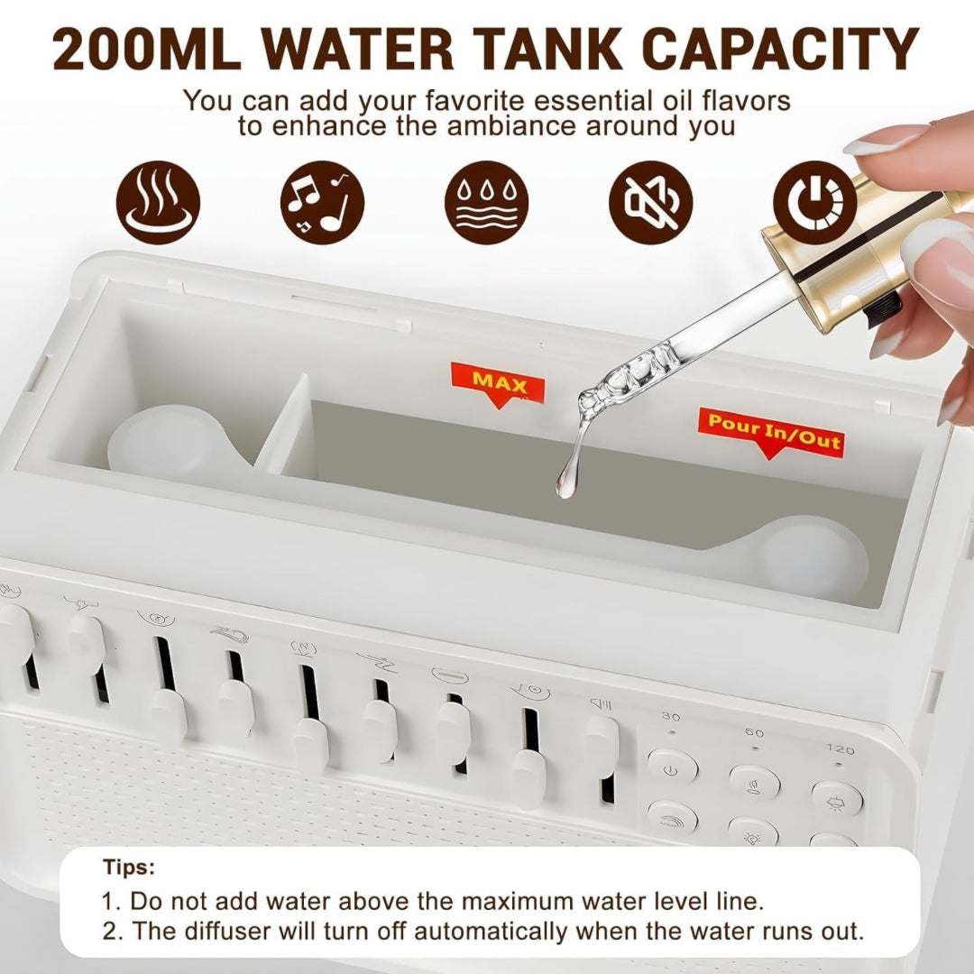 Transform your sleep environment with this all-in-one White Noise Sleeping Machine with Diffuser. Designed to relax your mind and body, it combines a white noise sound box, aromatherapy diffuser, humidifier, Bluetooth speaker, and night light into one sleek unit. Perfect for babies, adults, and anyone seeking deeper, uninterrupted sleep or calming relaxation at home, office, or meditation space.