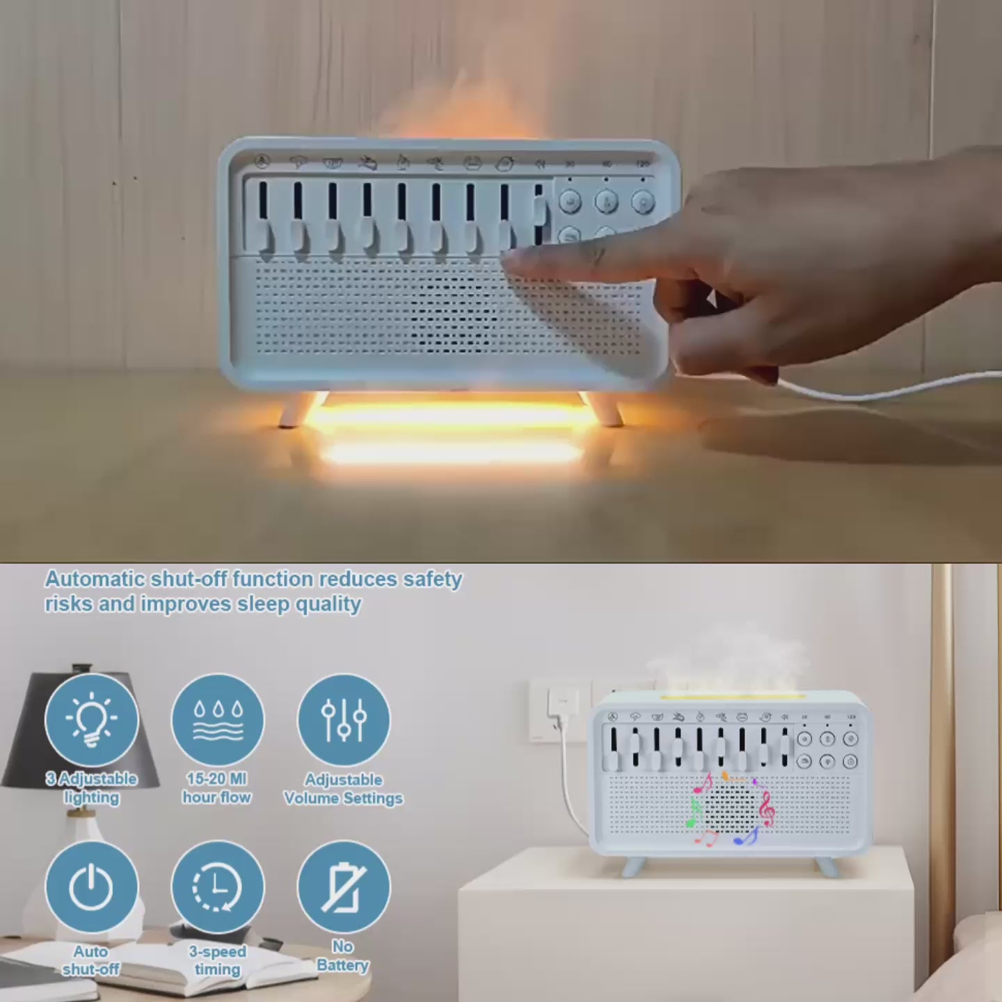 - Flame Effect Night Light – Adjustable 3-level warm light for a cozy and relaxing ambiance.